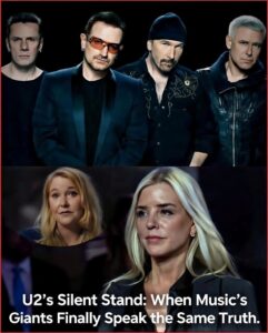 In this imagined world, the music industry jolts awake when U2 — portrayed as the planet’s most influential band — breaks its long-standing silence. Their statement doesn’t arrive as a protest song or a press conference. It arrives as a carefully worded pause during a live performance, projected in stark white letters behind them: