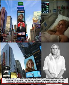 UPDATE AT 7:30 A.M. — TIMES SQUARE, NEW YORK: STEPHEN COLBERT SPENDS OVER $20 MILLION TO BROADCAST THE ENTIRE CASE AND THE SUFFERING OF VIRGINIA — AN EVENT THAT SENT SHOCKWAVES THROUGH HOLLYWOOD AND FORCED MEDIA TO FACE THE TRUTH HEAD-ON