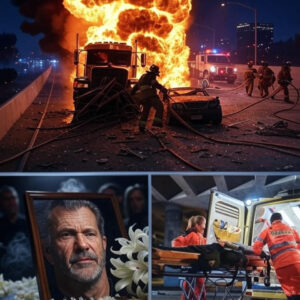 A peaceful Los Angeles Freeway erupted into a hellish blaze just hours ago, as Mel Gibson’s SUV slammed into a gas tanker, sparking a catastrophic explosion that claimed the actor’s life in an instant. Witnesses stared in horror as flames devoured both vehicles, black smoke billowing into the sky, shaking the ground beneath their feet. The sudden loss of a Hollywood legend has left fans gasping, their disbelief echoing through social media as police confirm the unthinkable. Firefighters fought valiantly against the inferno, but the scene remained a chaotic graveyard of twisted metal and shattered dreams. Traffic grinds to a halt for miles, while mourners gather, their tears blending with the ash. What led to this tragic collision—and what secrets lie in the wreckage?