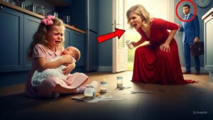 At the center of the scene is the little girl, her face streaked with tears, her small arms wrapped around her sibling as if shielding the baby from harm. Her sobs are not only out of fear but also from the unbearable weight of responsibility she should never have to carry.